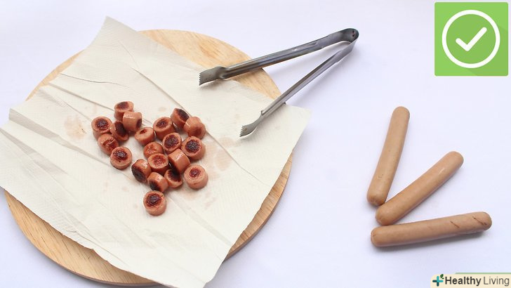 - Дістаньте сосиски з мікрохвильової печі і злийте воду.нехай вони постоять протягом 30 секунд, щоб сосиски могли охолонути і обсохнути.