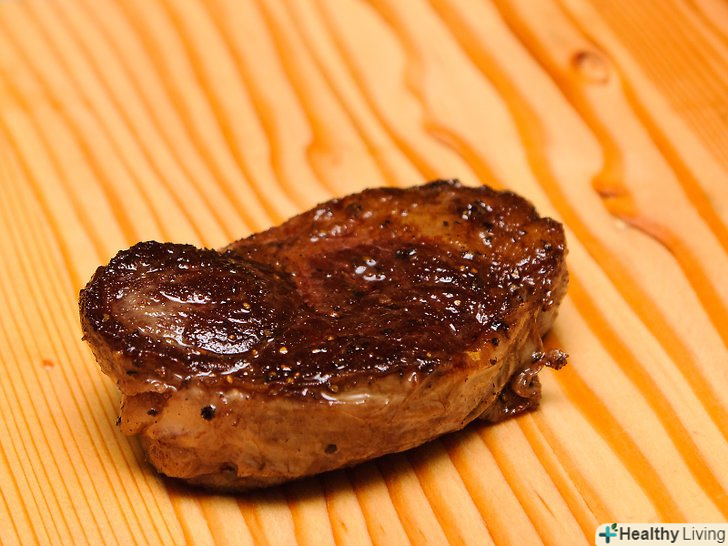 Після того, як ви витягнете стейк з духовки, дайте йому «відпочити» протягом 7-10 хвилин.[12] під час смаження зовнішні шари м'яса стискаються, і сік збирається в середині стейка. Якщо ви вирішите порізати стейк відразу після вилучення його з духовки, то сік просто витече на тарілку. Однак якщо дасте стейку «відпочити» протягом приблизно 8-9 хвилин, то цього часу буде достатньо, щоб верхні шари м'яса розширилися і повністю просочилися соком. Стейк від цього стане набагато соковитіше.- Можете накрити стейк алюмінієвою фольгою, щоб він залишався теплим. Робити цього необов'язково, особливо якщо ви готуєте в стінах будинку — в цьому випадку втрата тепла буде мінімальною. До того ж через фольги шкірка стейка буде менш хрусткою.[13]