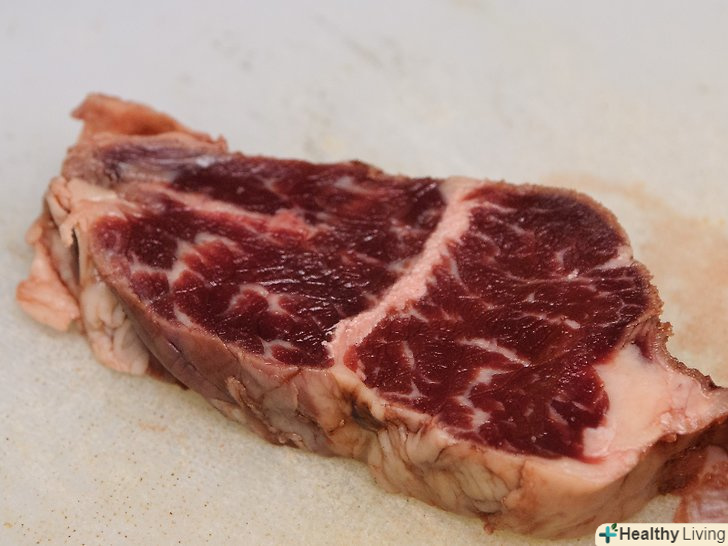 Почніть з товстих шматків стейка.для нашого методу найкраще підійдуть стейки товщиною в два сантиметри.[2] Так у них напевно утворюється скоринка. Чим тонше стейк, тим швидше він стане сухим і твердим.- Два великих стейки також легше купити і з'їсти, ніж зробити це з чотирма невеликими стейками. Якщо стейки дуже великі, то не бійтеся нарізати їх (звичайно ж, після готування) на порції. Вашим гостям буде все одно, тому що головне в стейку - його смак!