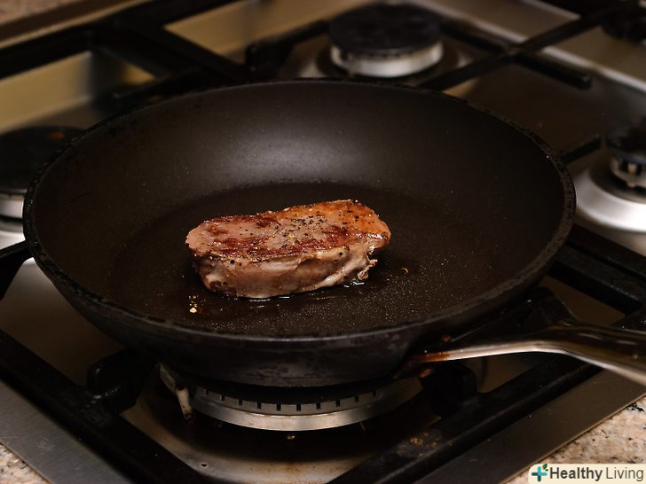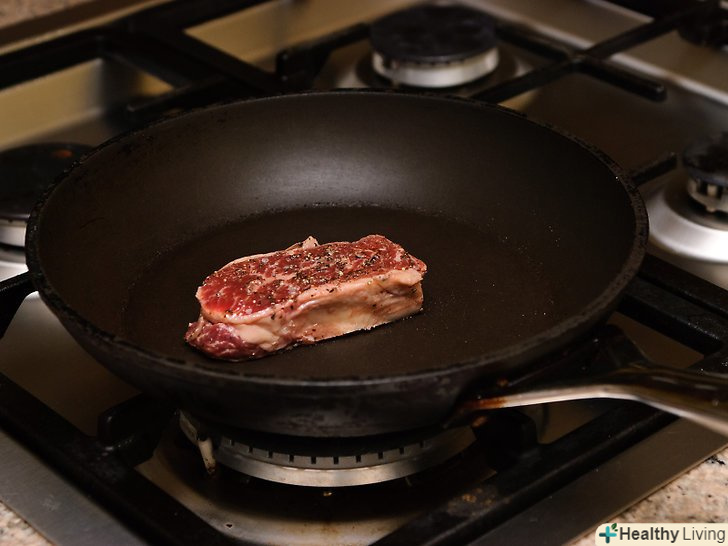 Налийте в чавунну сковороду масла і починайте нагрівати її на сильному вогні.так, спочатку ви будете готувати м'ясо на сковороді, але потім поставите його в духовку. Так роблять кухарі в ресторанах у всьому світі. Зараз у вас є шанс спробувати зробити це самостійно![7]- Використовуйте Нейтральне за смаком масло, наприклад, рапсове замість оливкового. Тим самим ви поліпшите природний аромат стейка.[8]