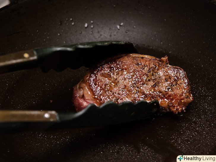 Ще раз промокніть стейк, щоб видалити надлишки вологи, і обережно покладіть його на чавунну сковороду.[9] щоб вас не забризкало маслом, підніміть сковороду за ручку від себе. Масло має стекти вниз. Покладіть стейк обережно на сковорідку і опустіть її назад на вогонь.- Час від часу рухайте стейк щипцями, щоб він прожарювався рівномірно, алене натискайте на м'ясо щипцями в спробі прискорити процес. Стейк прекрасно прожариться сам по собі. Якщо натискати на м'ясо, стейк вийде менш соковитим.