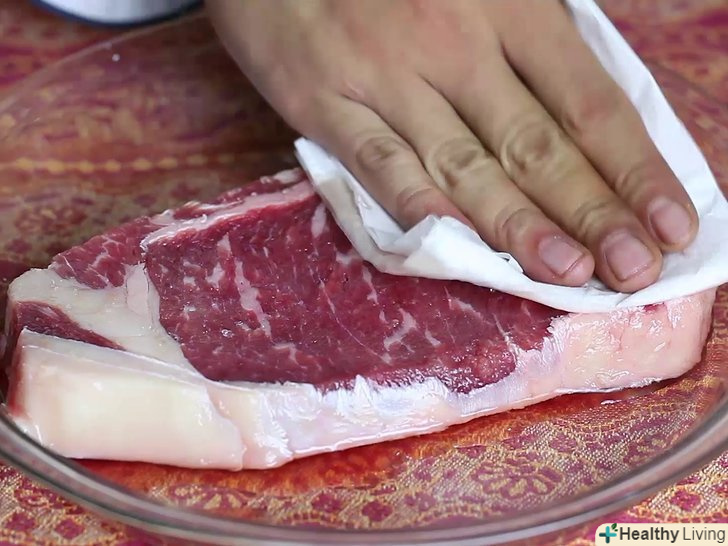 Витріть стейк з усіх боків насухо.в іншому випадку стейк вийде паровим, а не підсмаженим.[3] навіщо нам стейк, варений на пару, чи не так? Тому візьміть паперовий рушник і гарненько промокніть м'ясо, перш ніж зрадити його вогню.