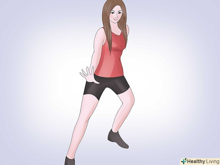 Стрибайте вліво. на слові" jump " трохи поверніться вправо і шаркніте лівою ногою перед собою.- Підстрибніть і розверніться в повітрі, так, щоб, коли ви приземлитеся на ліву ногу, дивитися трохи вліво.