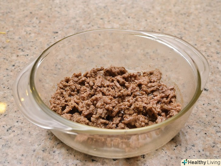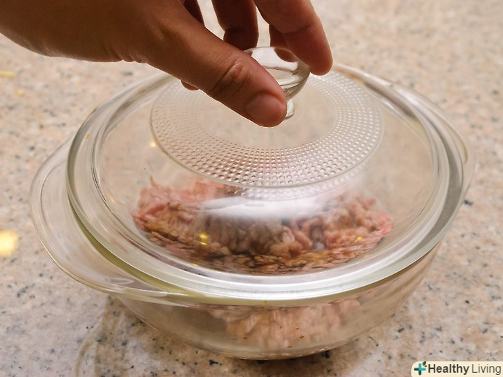 Покладіть фарш в глибокий посуд для мікрохвильової печі.помістіть в центр ємності друшляк, призначений для мікрохвильової печі, а потім покладіть фарш в центр друшляка.[3]- Друшляк класти необов'язково, проте з його допомогою можна позбутися від зайвого жиру. Також замість друшляка можна покласти сито або підставку для страви.