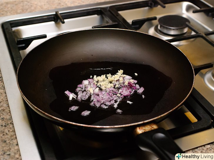 Обсмажте цибулю і часник.подрібніть цибулю і часник і викладіть на нагріту сковороду. Готуйте близько трьох хвилин, постійно помішуючи[4]- Готуйте, поки цибуля і часник не стануть м'якше і запашні. Лук повинен стати напівпрозорим, а часник — трохи потемніти.