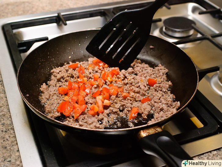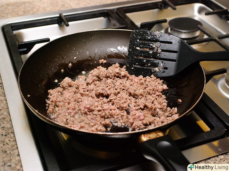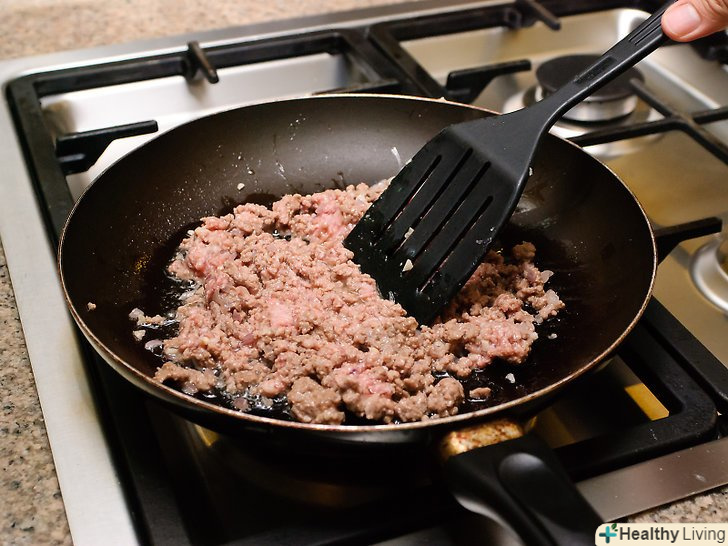 Обсмажте фарш.поки фарш готується, помішуйте його. Час готування має скласти 8-10 хвилин. Ретельно обсмажте м'ясо, перш ніж переходити до наступного кроку.- Фарш повинен обсмажити рівномірно з усіх боків. Якщо залишаться не до кінця обсмажені шматочки, нічого страшного — м'ясо доготовиться пізніше.