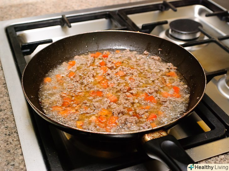 - На Середньому або швидкому вогні рідина буде випаровуватися досить швидко. Якщо ж рідини буде занадто багато, злийте надлишки, обережно нахиливши сковороду над раковиною. В принципі, можна готувати фарш у власному соку, але тоді на смак він буде не смаженим, а вареним.[2]