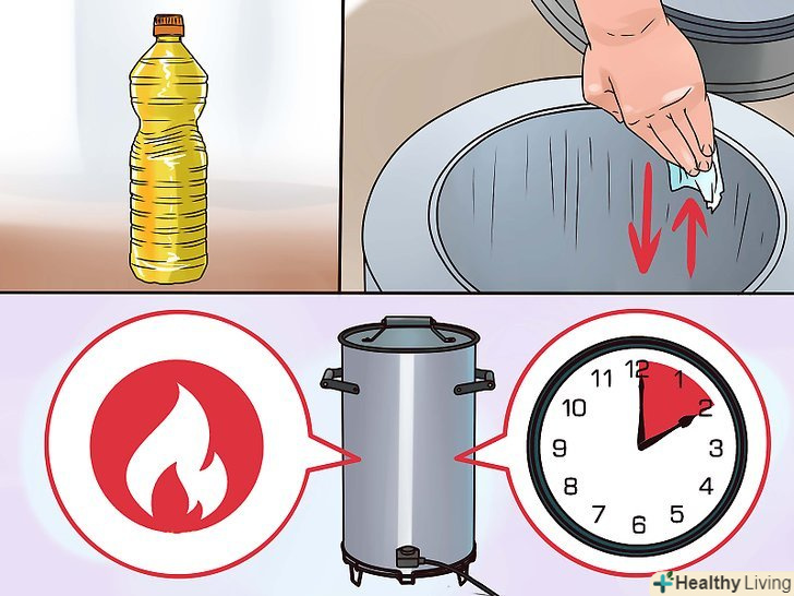 Дотримуйтесь вказівок, щоб підготувати новий прилад до роботи.цей процес прибирає запахи, пил і розчинники. Перед тим, як в ньому готувати, ви повинні обробити свій прилад.- Протріть полиці і внутрішні частини вашої коптильні маслом для готування.