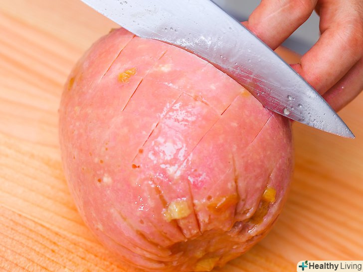 Зробіть надрізи на окосту, якщо ви плануєте глазурувати його.робіть надрізи на шкірі і жирі, але не на м'ясі. Робіть надрізи хрест-навхрест, щоб в результаті вийшов візерунок. Надрізи допоможуть соусу проникнути якомога глибше і передати смак і аромат м'яса до самої середини.- Якщо у вас попередньо нарізаний окіст, пропустіть цей крок.