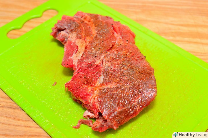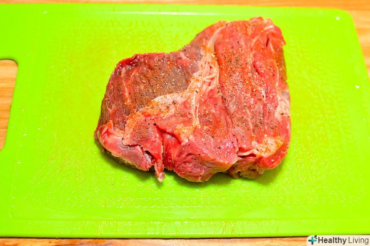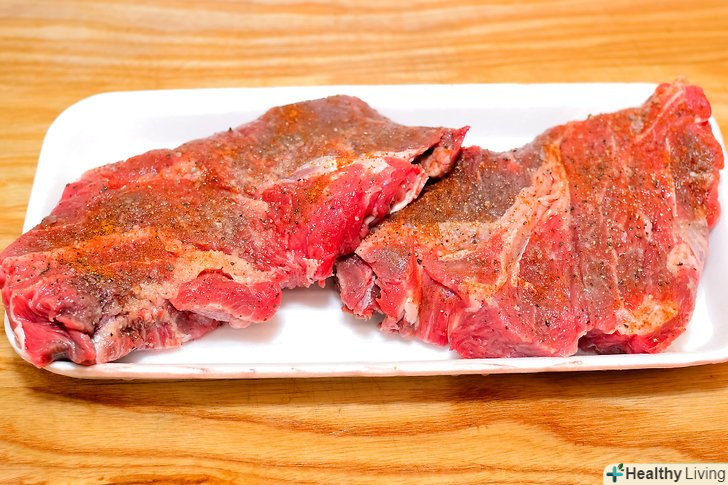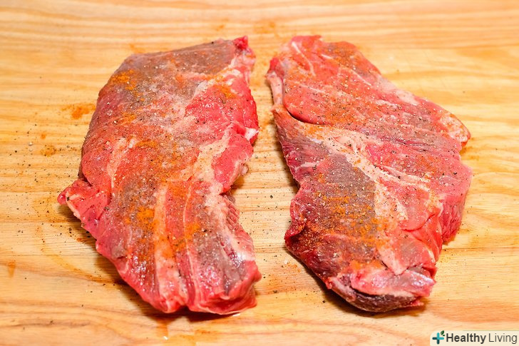 Приправте м'ясо на свій смак.для хорошого стейка не буде потрібно багато приправ, досить рясно посолити і поперчити з обох сторін.- Ви можете додати часниковий порошок, кайенский перець, мелений червоний перець або італійські спеції.