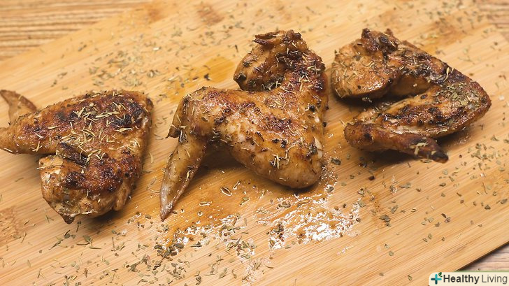 - Переконайтеся, що крильця повністю готові.перш ніж знімати крильця з вогню, необхідно переконатися, що вони повністю готові і не рожеві всередині. Перевірте найтовстішу частину крила або найбільше крильце за допомогою вилки. Якщо сумніваєтеся, залиште м'ясо на вогні ще на кілька хвилин.[14]