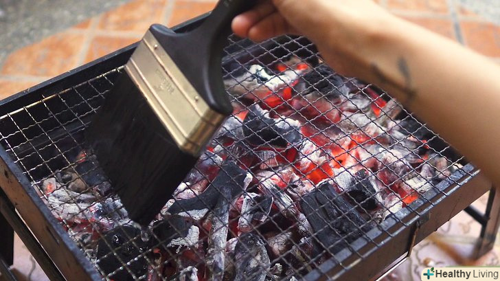 Обробіть решітку гриля рослинним маслом, щоб крильця не прилипали.використовуйте серветку або кулінарну кисть і рослинне масло, щоб акуратно обробити решітку. Так курка не буде прилипати до грат і відриватися при спробах зняти готові крильця з вогню.[8]- Якщо потрібно змастити гарячу решітку, змочіть в маслі паперовий рушник і утримуйте його довгими металевими щипцями.
