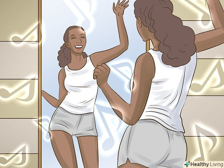 Тренуйтеся перед дзеркалом.тренування перед дзеркалом дозволить побачити себе з боку під час танцю. Можливо, зараз ви соромитеся танцювати, але після того, як побачите себе в відображенні, ви зрозумієте, що Ви танцюєте не так погано, як думали! Крім того, можливо, спостерігаючи за собою у відображенні, ви побачите, що деякі рухи виглядають не дуже красиво, і зрозумієте, над чим варто ще попрацювати.[11]- Спостерігаючи за собою в дзеркало, ви зможете визначити, які рухи варто змінити, а над якими просто потрібно попрацювати — це додасть вам впевненості на танцполі.
