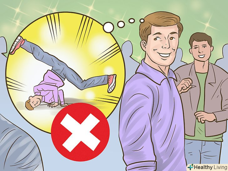 Уникайте якихось незручних і занадто швидких рухів.якщо ви турбуєтеся про те, що будете соромитися того, як Ви танцюєте, слід дотримуватися більш базових рухів. Не намагайтеся повторити якийсь неймовірний рух, який ви лише раз побачили на шоу танців. Довірте це професіоналам і включіть в свій танець тільки ті рухи, які точно будуть виглядати добре. Наприклад, не варто зображувати елементи брейка, крампа та інших стилів, які можуть привернути надмірну увагу.[4]- Знову ж таки, уникайте різких і ковзаючих рухів (наприклад, "місячну ходу"). Погодьтеся, навряд чи у вас вийде ковзати так само, як у Майкла Джексона.