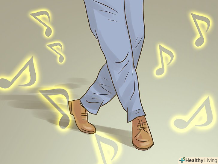 Вивчіть базові рухи ніг.навчившись рухати в ритм руками, підключіть до танцю ноги. Можна почати з найпростішого: підніміть одну ногу, потім іншу (руху приблизно схожі на марширування на місці). Якщо ви відчуваєте себе досить комфортно, можна спробувати трохи згинати коліна і трохи підстрибувати в ритм музики. Спробуйте злегка підстрибувати і додайте кроки в сторону.[9]- Постарайтеся включити в танець стегна і всю нижню половину тіла.