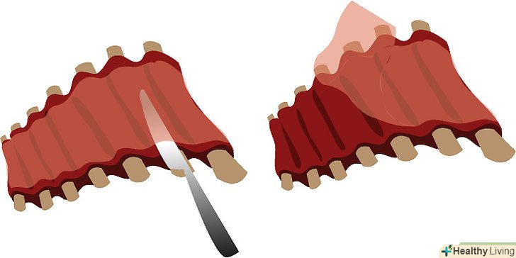 Зніміть м'язову тканину або пліву, яка покриває кістляву сторону ребер.ви ж хочете, щоб копчені яловичі ребра були м'якими, а м'язова тканина жорстка і жилава.- Ножем плавно рухайтеся під плівою так, щоб ви змогли очистити її.