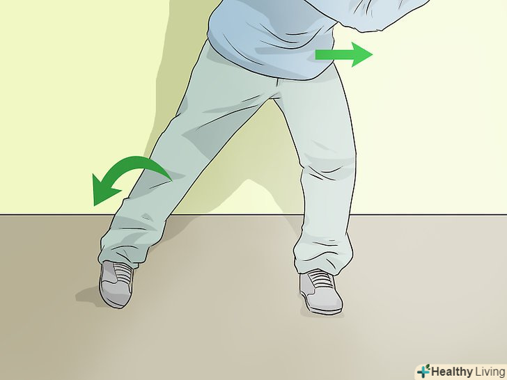 Поміняйте ногу.тепер ваша ліва нога стане» стіною " ногою, а права нога стане вашою опущеною ногою, тому переконайтеся, що ви твердо поставили цю ногу. Ви можете легко змінювати ноги нахиляючи ваше тіло в іншу сторону, зробивши крок вашої "стінки «ногою назад і зробивши крок Вашої» не-стінки" ногою вперед, перед заміною ніг, так що ваші ноги будуть перебувати на одній лінії з плечима, або ви можете навіть зробити його більш витонченим рухом, зберігаючи положення вашого тулуба в більш вертикальному положенні при заміні ніг.
