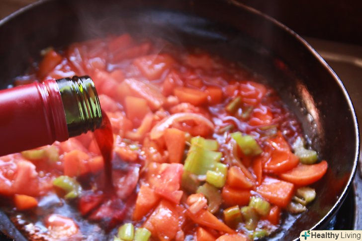 Додайте в овочі вино, кетчуп і помідори і перемішайте їх.залийте в сковороду 1 склянку (240 мілілітрів) сухого червоного вина і перемішайте овочі, поки вони не почнуть булькати. Обов'язково поскребіть дно сковороди, щоб до нього не пристали овочі або м'ясо. Додайте 1/3 склянки (80 мілілітрів) кетчупу і 400 грамів консервованих у власному соку помідорів (подавіть їх руками і покладіть в сковороду разом з соком).[10]