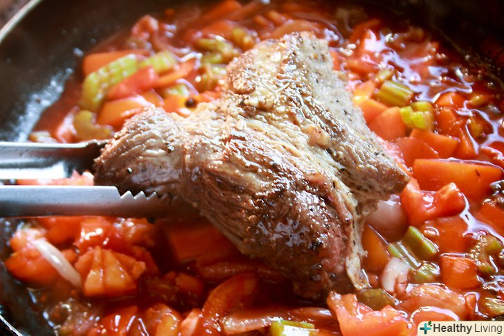 Приправте і обсмажте грудинку.візьміть велику сковороду з нержавіючої сталі і поставте її на середній або сильний вогонь. Налийте в сковороду 2 столові ложки (30 мілілітрів) рослинного масла. Поки масло розігрівається, дістаньте 2,8 кілограма цільної яловичої грудинки і посипте її з обох сторін среднезернистой сіллю і меленим чорним перцем. Покладіть м'ясо в гаряче масло і смажте приблизно 6 хвилин. Після цього акуратно переверніть грудинку і смажте на другій стороні ще 6 хвилин.[7]- Поставте сковороду між двома запаленими конфорками, щоб вона рівномірно розігрівалася.