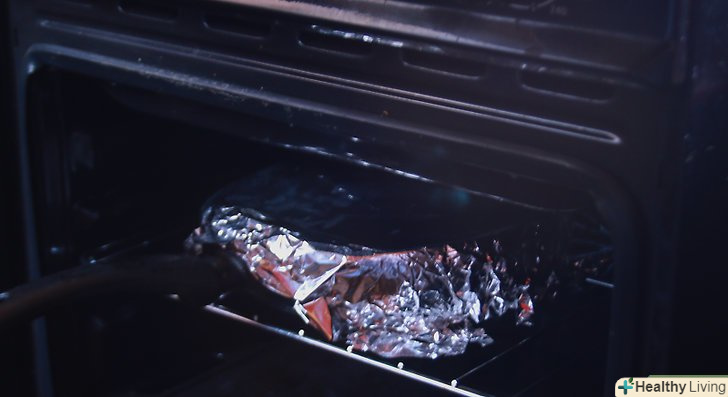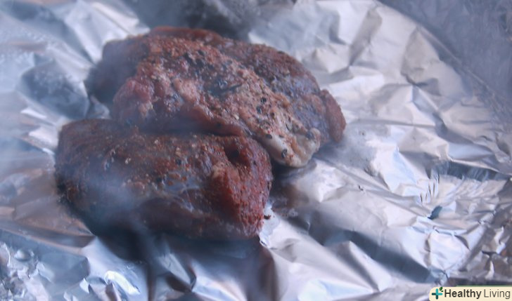 Покладіть м'ясо у формі з фольги на решітку гриля.Візьміть одноразову форму з алюмінієвої фольги і покладіть в неї грудинку так, щоб більш жирна сторона була зверху. Розмістіть форму в центрі решітки, щоб вона не знаходилася прямо над палаючими вугіллям. Накрийте гриль кришкою.[18]