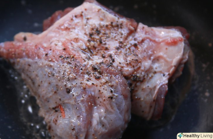 Приправте і обсмажте грудинку.візьміть 1,6 кілограма яловичої грудинки і промокніть її паперовими рушниками, щоб видалити зайву вологу. Посипте м'ясо кількома великими щіпками крупнозернистої солі і меленого чорного перцю. Поставте на плиту другу сковороду і включіть під нею середній або сильний вогонь. Покладіть грудинку на гарячу сковороду і смажте її кілька хвилин. Після цього переверніть м'ясо і смажте до тих пір, поки воно не стане золотисто-коричневим.[2]- При смаженні грудинка, швидше за все, буде сильно диміти. Відкрийте вікно або включіть витяжку.