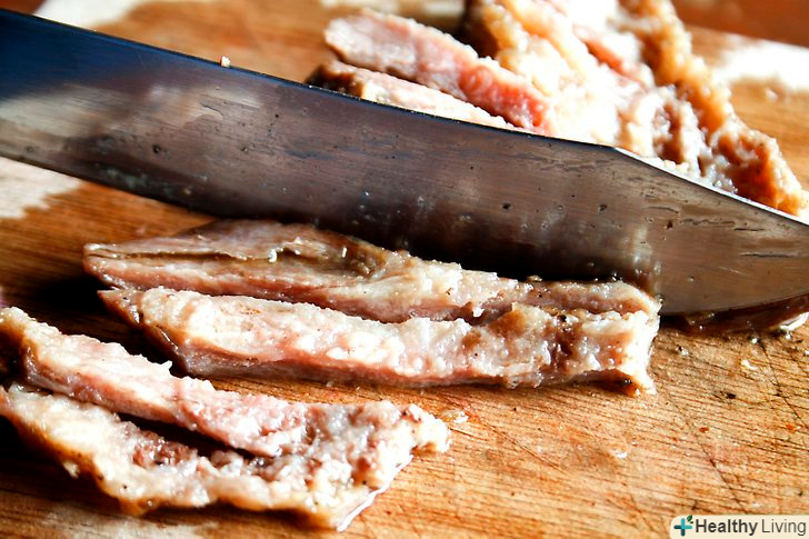 Наріжте і сервіруйте м'ясо.дістаньте грудинку з медленноварки і поріжте її гострим ножем на довгі скибочки. Розріжте м'ясо поперек волокон, щоб воно залишилося ніжним і його було зручніше їсти. Можна також взяти дві вилки і розділити м'ясо на дрібні шматочки. Сервіруйте грудинку разом з бульйоном і розм'яклим цибулею з медленноварки.[6]- Зберігайте м'ясо, що залишилося в холодильнику. При цьому жир спливе вгору і застигне, так що його потрібно буде зняти перед тим, як розігріти м'ясо. Розігрівайте грудинку в духовці на слабкому вогні протягом приблизно однієї години.
