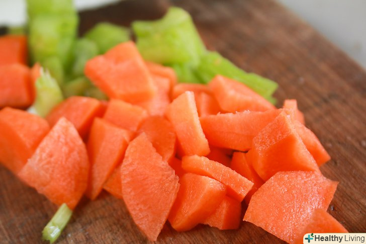 Наріжте овочі.помийте 500 грамів моркви, або близько 6 середніх морквин, і наріжте їх невеликими шматочками. Помийте 230 грамів (приблизно 4 стебла) селери і також поріжте його. Крім того, почистіть 1 кілограм жовтої цибулі, або близько 5 середніх цибулин, і наріжте їх кільцями товщиною 5 міліметрів.[8]