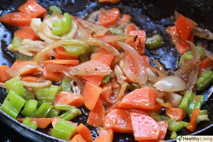 Обсмажте овочі.перекладіть грудинку в деко і відставте його в сторону. Засипте в звільнилася сковороду цибулю, моркву, селеру і 6 зубчиків часнику. Смажте овочі на середньому вогні близько 6 хвилин. Помішуйте їх, щоб вони не пристали до сковороди.[9]- При цьому овочі стануть м'якими і почнуть набувати золотисто-коричневий відтінок.