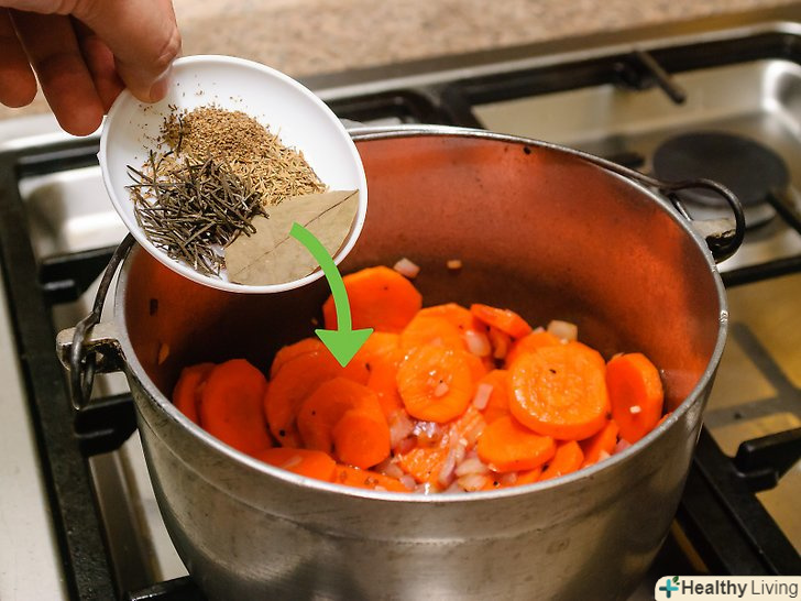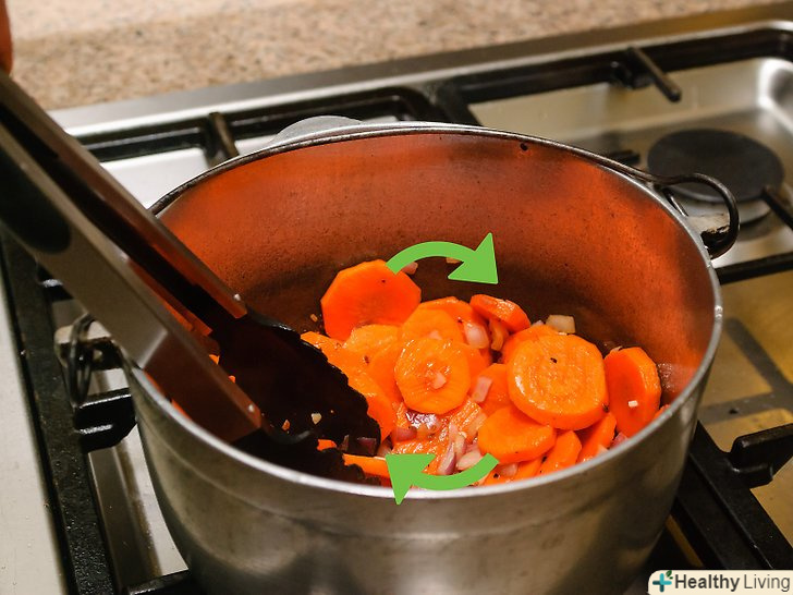 Підготуйте цибулю, моркву і часник.помістіть ці інгредієнти в розігріте масло, яке залишилося в жаровні після обсмажування грудинки. Часто помішуючи, обсмажуйте цибулю до золотистого кольору. Це займе ще близько 4 хвилин.- Додайте ще масла, якщо в жаровні його залишилося мало, після того як Ви додали туди овочі.