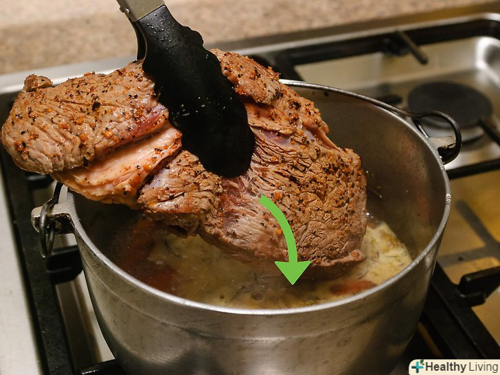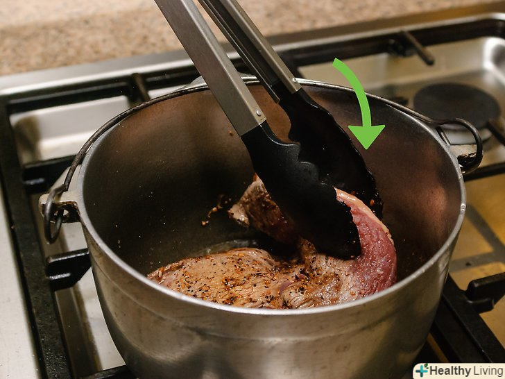 Обсмажте грудинку з усіх боків.покладіть грудинку в розігріте масло і обсмажуйте, поки вона не стане рум'яною з усіх боків. За необхідності використовуйте щипці. Буде потрібно від 3 до 5 хвилин, щоб обсмажити грудинку з кожного боку.- Після цього дістаньте грудинку з жаровні і залиште її в теплому місці.