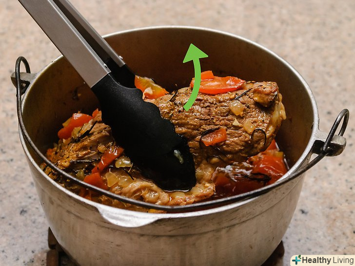 Запікайте до готовності.це може зайняти від 2 1/2 до 3 годин.[4] під час приготування, кришка жаровні повинна бути щільно закрита. Зняти кришку ви можете тільки для того, щоб перевірити готовність м'яса.- Перевірте температуру всередині грудинки, використовуючи спеціальний термометр для м'яса. Температура повинна бути в межах 190-200 градусів за Фаренгейтом (88-93 градуси за Цельсієм). М'ясо повинно бути досить ніжним і легко відділятися.