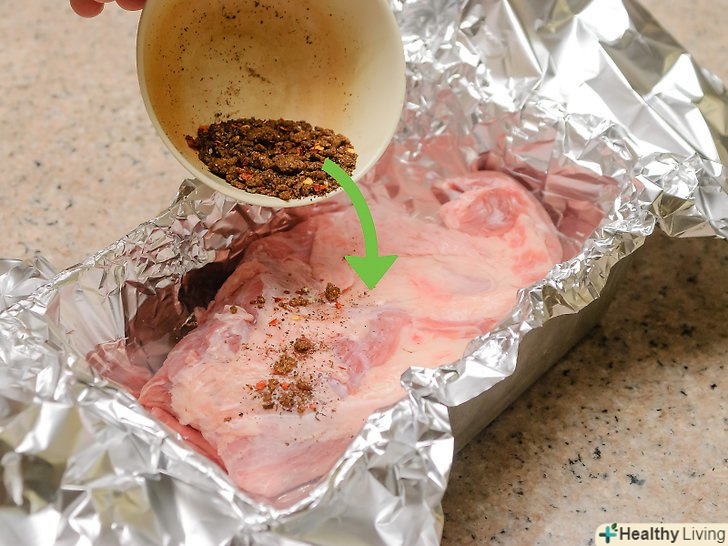 Посипте м'ясо приправами.посипте грудинку і воду приправами.- Зробіть невеликі надрізи в грудинці. Завдяки цьому, грудинка просочиться ароматом приправ рівномірно. В іншому випадку, весь аромат буде зосереджений тільки на верхній частині грудинки.