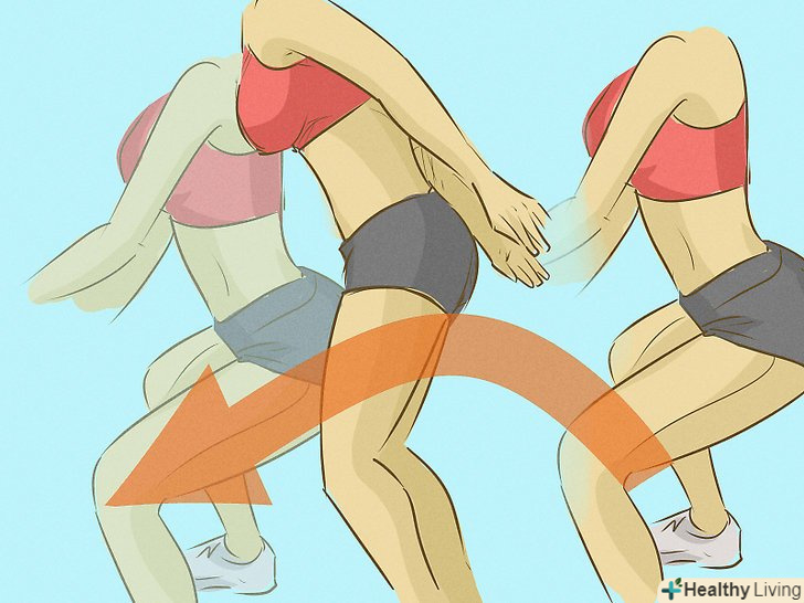 Нахиліться вперед.як і раніше тримаючи ноги на ширині плечей, нахиліть тулуб вперед під кутом приблизно 90 градусів. Після цього продовжуйте крутити стегнами, здійснюючи ними короткі часті рухи. Продовжуйте трясти попою стільки, скільки забажаєте.- Слідкуйте за руками, не дозволяючи їм вільно бовтатися. Коли ви трясете попою, ваші руки не повинні безвольно звисати, подібно мотузкам. Зігніть їх під прямим кутом.[6]