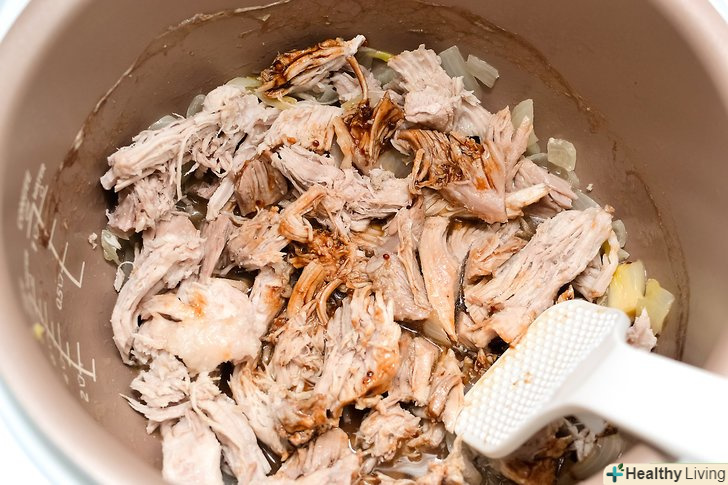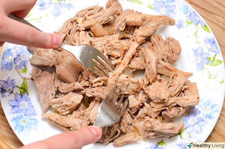 Вийміть свинину і дайте стекти рідини, яка залишилася від приготування.потім за допомогою двох вилок наріжте його на шматочки.