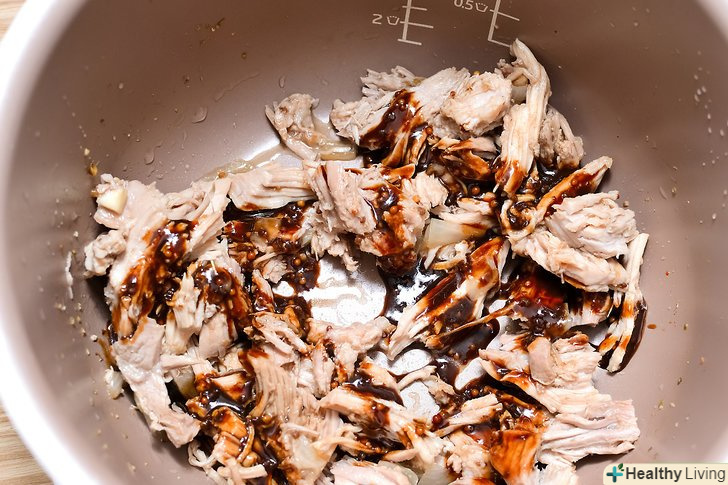 Подолжаем приготування.Нашатковане м'ясо знову покладіть в автоклав, додайте до нього чашку соусу для барбекю. Гасіть свинину ще 30-60 хв. на повільному вогні.