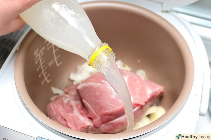 Помістіть інгредієнти в горщик.покладіть нарізану цибулю на дно горщика, зверху викладіть м'ясо і накрийте ще одним шаром цибулі. Залийте свинину і цибулю імбирним пивом.
