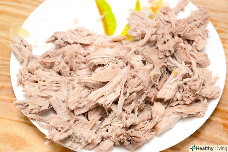 Злийте рідину і обробіть м'ясо.коли м'ясо готове, злийте рідину, вийміть свинину, а цибулю залиште в горщику. Використовуючи дві вилки, розберіть м'ясо на шматочки, прибираючи зайвий жир і кістки. Велика частина жиру розплавиться при гасінні.