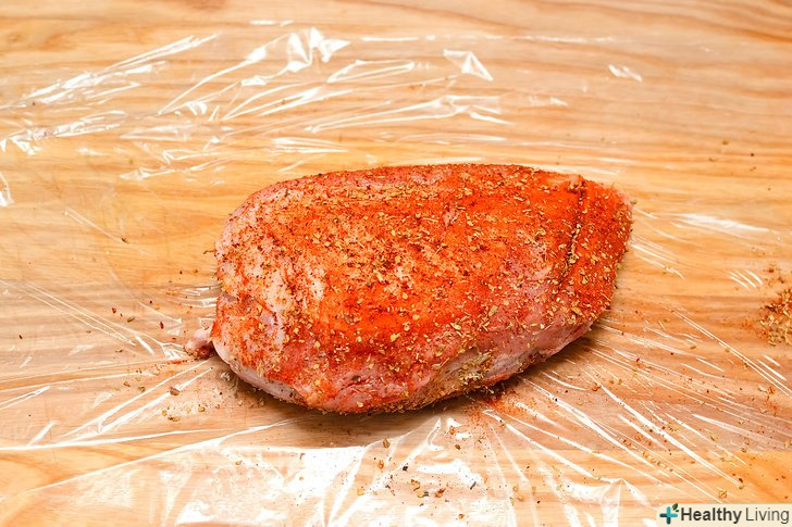 Втираємо отриману суміш в м'ясо.посипаємо сумішшю спецій м'ясо і масажними рухами розподіляємо спеції по всьому шматку. Потім обертаємо його подвійним шаром харчової плівки і прибираємо в холодильник як мінімум на 3 години. Замариноване м'ясо може зберігатися в холодильнику і 3 дні, чим більше часу воно пробуде в маринаді, тим ароматні м'ясо ви отримаєте при приготуванні.