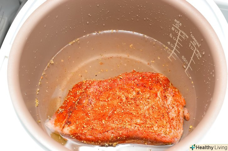 Поміщаємо м'ясо в автоклав (crockpot).коли свинина замаринувалася потрібну вам кількість часу, дістаємо її з холодильника, розмотуємо плівку, в якій воно зберігалося, і поміщаємо в автоклав. Заливаємо м'ясо 1/4 чашкою води і додаємо рідкий дим (за бажанням). Накриваємо кришкою і при низькій температурі готуємо 8-10 годин. Ступінь готовності м'яса можна перевірити за допомогою вилки, якщо вилка легко входить, то м'ясо готове