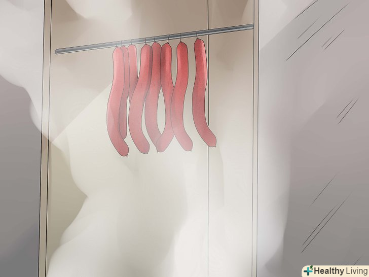 Підкоптіть ковбасу.це дасть їй класичний смак - "з димком". Розпаліть коптильню, діючи строго за інструкцією. Потім помістіть ковбасу в коптильню на 4 години. Можна і довше, якщо вам подобається смак диму. Ланки ковбаси повинні дійти до внутрішньої температури в 155 градусів.- Кращий вибір для копчення - вишневі та яблуневі дрова, адже сорт використовуваної деревини багато в чому визначає і смак майбутньої ковбаси.[3]