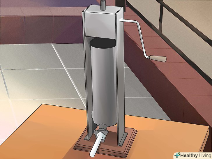 Начините оболонку фаршем.заповніть шприц фаршем. Якщо залишиться зайвий фарш, покладіть його в крижану миску. Далі почніть заповнювати оболонку фаршем, і не гребуйте поправляти оболонку рукою, щоб та випадково не порвалася. Іншою рукою, відповідно, продовжуйте подавати фарш.- Не поспішайте, особливо коли робите ковбасу в перший раз - так і оболонку порвати недовго.