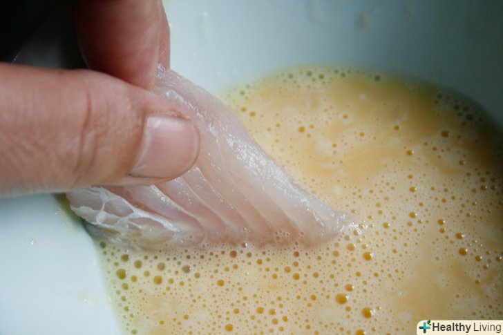 Покрийте рибу яєчною сумішшю.занурте кожне філе риби в яєчну суміш.- Потримайте філе над мискою протягом приблизно 30 секунд. За цей час стече надлишок суміші.