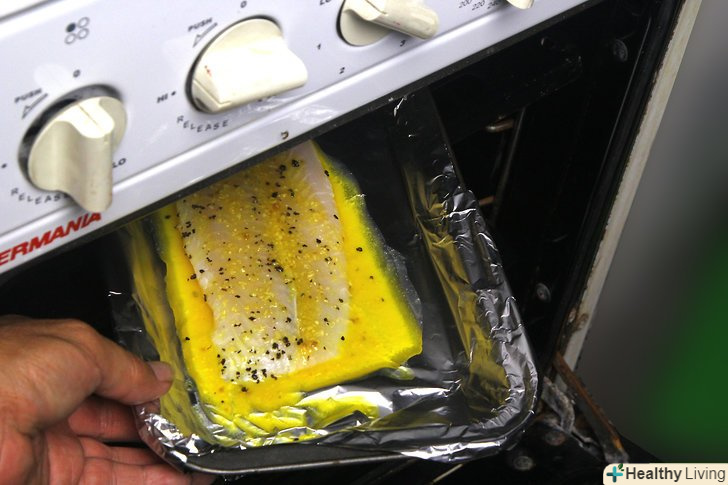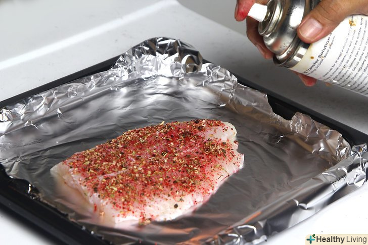 Попередньо розігрійте духовку до 220 °C і змастіть форму для випічки.візьміть форму для випічки розміром 22х33 сантиметри і збризніть кулінарним спреєм, щоб риба не пригоріла. Відставте форму в сторону і займіться підготовкою риби.[7]- Якщо під рукою немає кулінарного спрею, змастіть дно форми розтопленим вершковим або рослинним маслом.