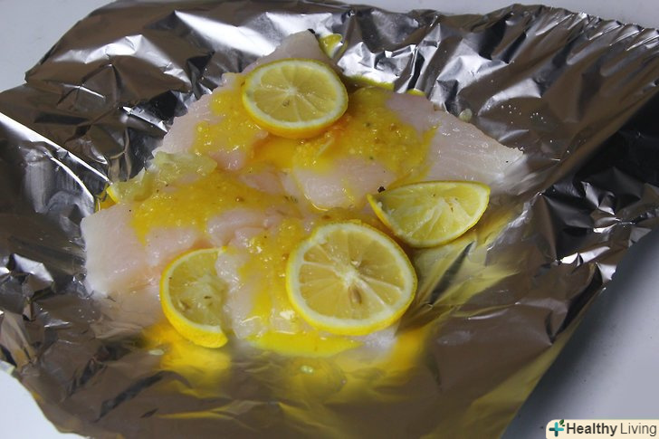 Покладіть рибу на фольгу, додайте масло і часточки лимона.покладіть 1 філе замороженої тілапії в центр шматочка фольги. Повторіть процедуру з кожним філе. Приправте рибу сіллю і перцем за смаком. Візьміть 2 столові ложки (28 грам) вершкового масла і наріжте тонкими шматочками. Покладіть на кожне філе кілька шматочків масла і 2 слайса лимона.[14]