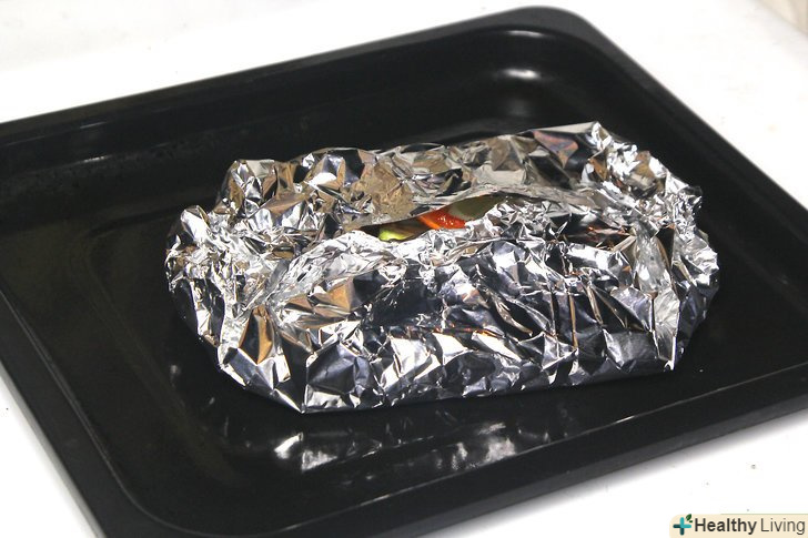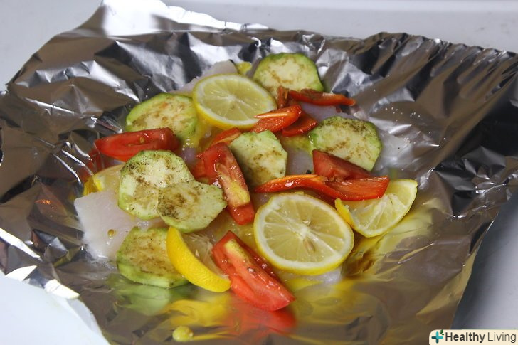 Розкладіть на рибу овочеву суміш і запечатайте пакети з фольги.покладіть ¼ склянки (40 грам) овочевої суміші поверх кожного філе риби. Складіть обидві довгі сторони фольги до центру і скріпіть їх разом. Решта краю підверніть таким чином, щоб щільно запечатати пакет.[16]