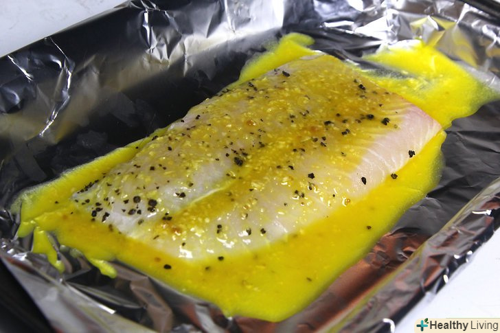 Промийте та висушіть заморожену тілапію.Візьміть 450 грам філе і обполосніть холодною водою. Промакніте рибу насухо паперовими рушниками і покладіть на підготовлений деко.[3]