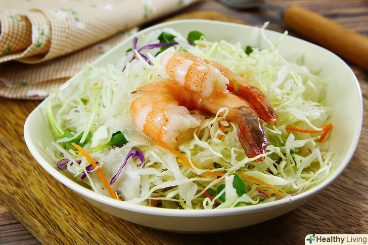 Додайте креветки в салати.Салат стане відмінним варіантом для обіду або вечері. Всипте в нього жменю креветок, якщо хочете додати білка. Тепер ваш салат буде ситним, що скоротить кількість перекусів протягом дня.