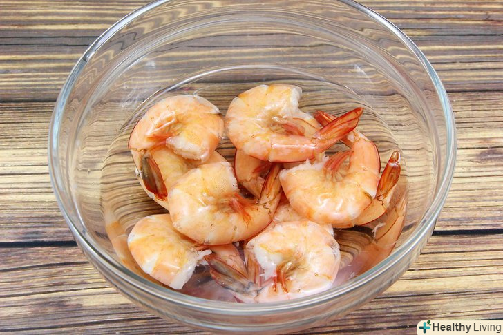 Розморозьте креветки в холодній воді протягом 15 хвилин.якщо у вас немає можливості чекати всю ніч, покладіть креветки в миску з холодною водою. Поставте миску в раковину і відкрийте кран, щоб холодна вода стікала тонкою цівкою. Залиште миску в раковині на 15 хвилин, щоб лід з креветок повністю розтанув.[2]
