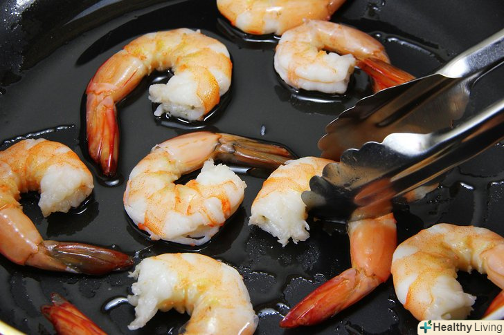 Обсмажте креветки на сковороді.поставте сковороду на вогонь і налийте в неї стільки масла, щоб дно було повністю покрито. Рівним шаром розподіліть креветки і готуйте 2-3 хвилини з кожного боку.[7]