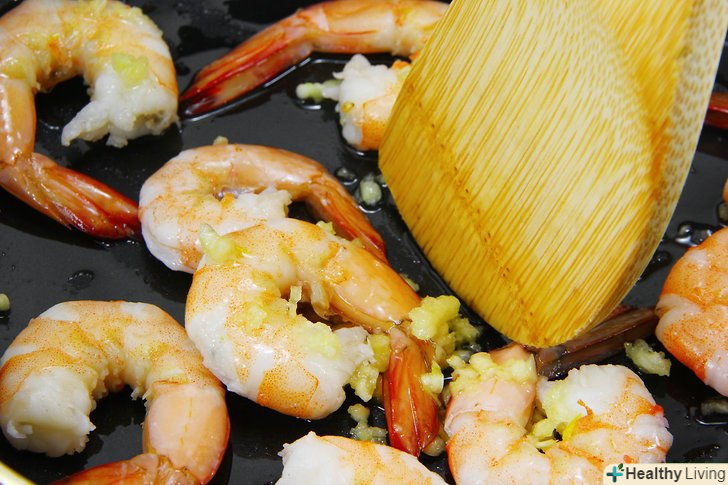 Приготуйте креветки у вершковому маслі з часником.проста суміш часнику і вершкового масла додасть креветкам легкий приємний смак. Додайте до креветок чайну ложку масла і пару рубаних зубчиків часнику. Перемішайте, щоб креветки рівномірно вкрилися сумішшю масла і часнику, і отримуйте задоволення від смаку страви.[9]